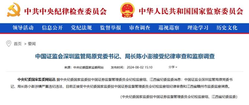 8月2日,中央纪委国家监委官网通报,中国证监会深圳监管局原党委书记、局长陈小澎涉嫌严重违纪违法,目前正接受中央纪委国家监委驻中国证券监督管理委员会纪检监察组纪律审查和江西省赣州市监委监察调查。