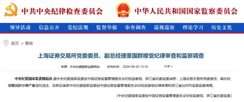 同日,据中央纪委国家监委驻中国证券监督管理委员会纪检监察组、浙江省纪委监委消息:上海证券交易所党委委员、副总经理董国群涉嫌严重违纪违法,目前正接受中央纪委国家监委驻中国证券监督管理委员会纪检监察组纪律审查和浙江省台州市监委监察调查。