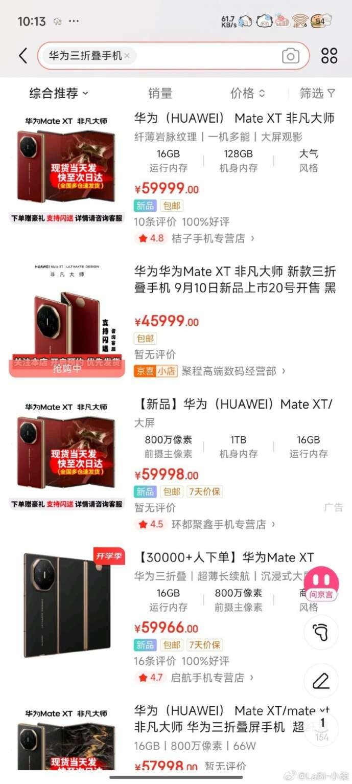 华为MateXT非凡大师于今天(9月20日)10:08开售,同一用户仅限购买一台。其中256GB版本售价19999元、512GB版本售价21999元、1TB版本售价23999元。开售后,Mate XT非凡大师全部型号迅速售罄。华为商城、京东、天猫旗舰店等线上平台均“暂时缺货”。