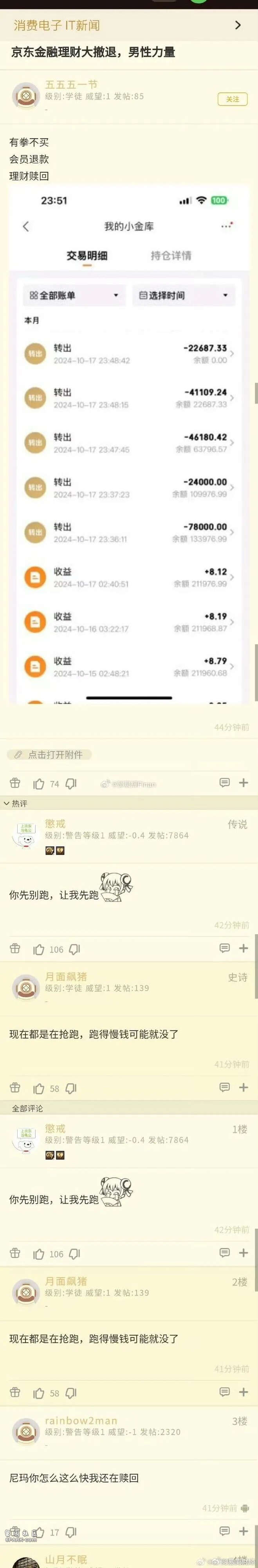 一个真正有一百万真金白银的人,其实他们真正在意的,是自己的真金白银是不是有风险,他们是不在意男女拳的——所以这个人表示,为了规避风险,他要把放在京东里面的钱取出来。