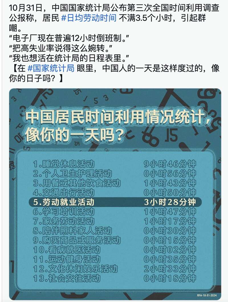 据了解,第三次全国时间利用调查的现场调查时间为2024年5月11日至31日,调查对象为抽中调查户和该户中6周岁及以上常住成员,全国共调查3.85万户家庭、10.7万人。