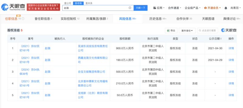 天眼查商业履历信息显示,赵薇名下共关联15家公司,其中9家为存续或开业状态,包括合宝文娱集团有限公司、西藏龙薇文化传媒有限公司、北京易聚创意科技有限公司等,赵薇在上述公司担任股东、董事等职务。值得一提的是,赵薇名下的上海欣艺文化传播有限公司、北京龙腾汇餐饮管理有限公司等4家公司已被吊销。天眼风险信息显示,赵薇现存5条股权冻结信息,冻结股权数据合计1850万人民币。