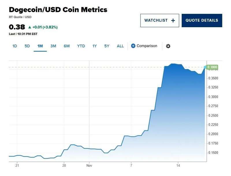 | “狗币”自美国大选日以来上涨了153%,成为市值第六大加密货币。同期比特币涨幅仅为30%。消息来源:美国消费者新闻与商业频道(CNBC)
