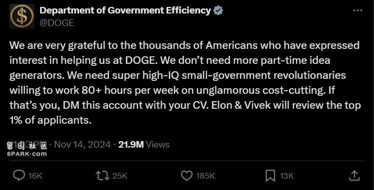 | “政府效率部”在X平台上“招聘”员工。