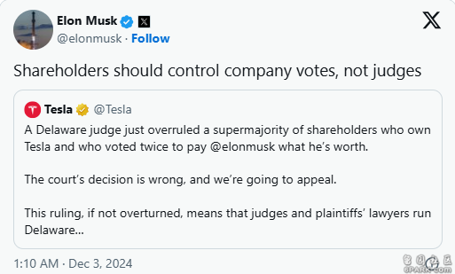 特斯拉电动车公司的官方X帐号贴文中表示:「这项裁决,如果不被推翻,这意味着法官和原告律师,有权介入公司的经营;但是公司的合法所有者是股东才对。 」