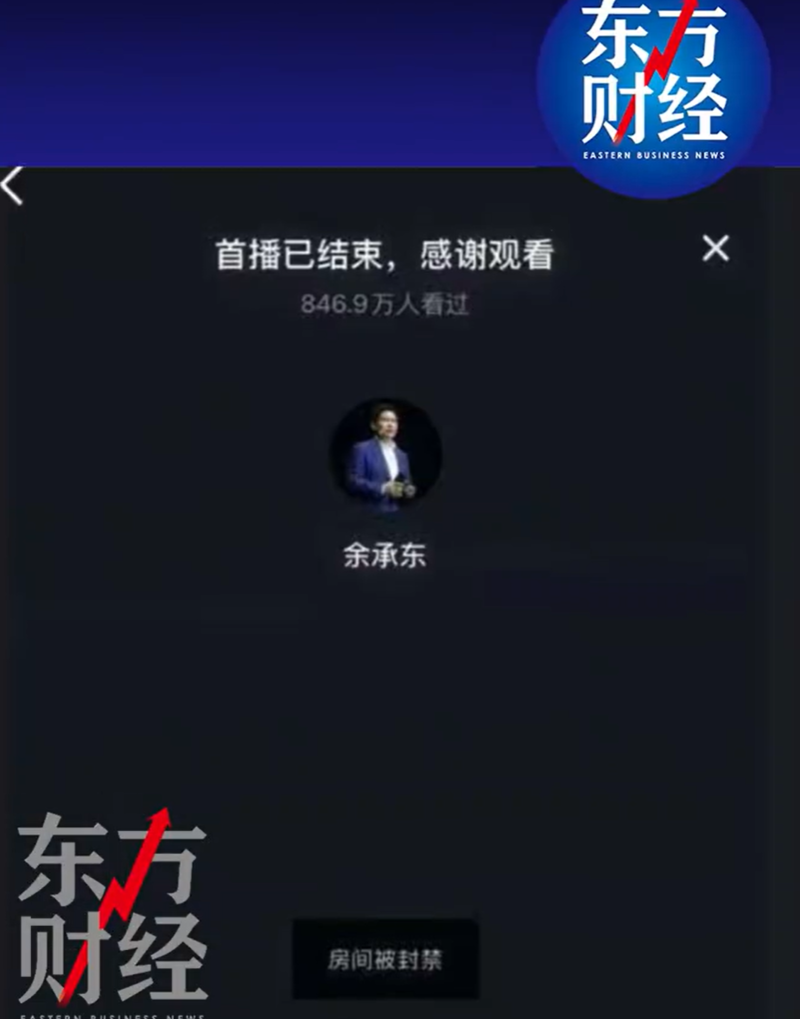 中午12时左右,余承东的抖音直播间突然暂停,同时显示“房间被封禁”。直播停止,此时有846.9万人观看了直播。