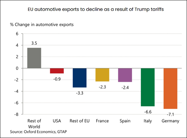 美国关税对欧洲汽车行业的影响图表。牛津经济研究院