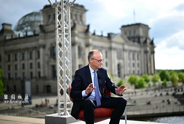7月13日,德国总理默茨接受德国ARD电视台采访。背景可见德国联邦议会大楼。 视觉中国