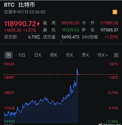 周日晚间,比特币突然异动直线拉升,截至发稿,比特币涨幅超1%。盘中一度突破119000美元,再创历史新高。