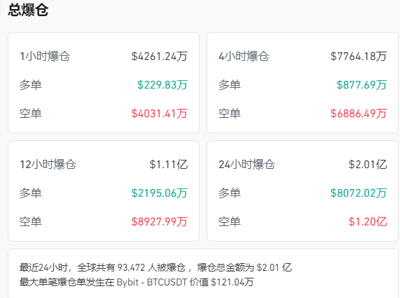 Coinglass数据显示,过去24小时内,比特币共有超9万人爆仓。