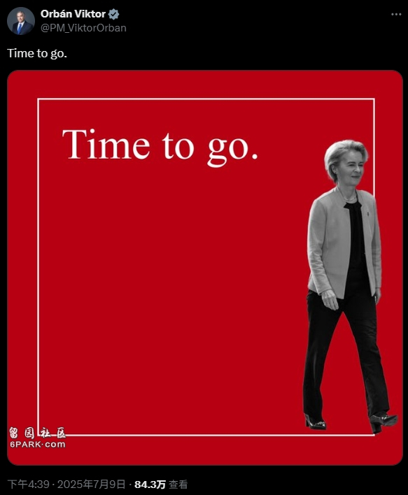 “冯德莱恩该走了。”9日,匈牙利总理欧尔班在社交媒体X平台发文,并配了张冯德莱恩走出红色框架的图片。欧尔班坚持认为,冯德莱恩应该被免职。