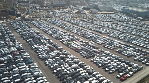 新车停放在德国的一个物流中心里等待出口。 视频截图