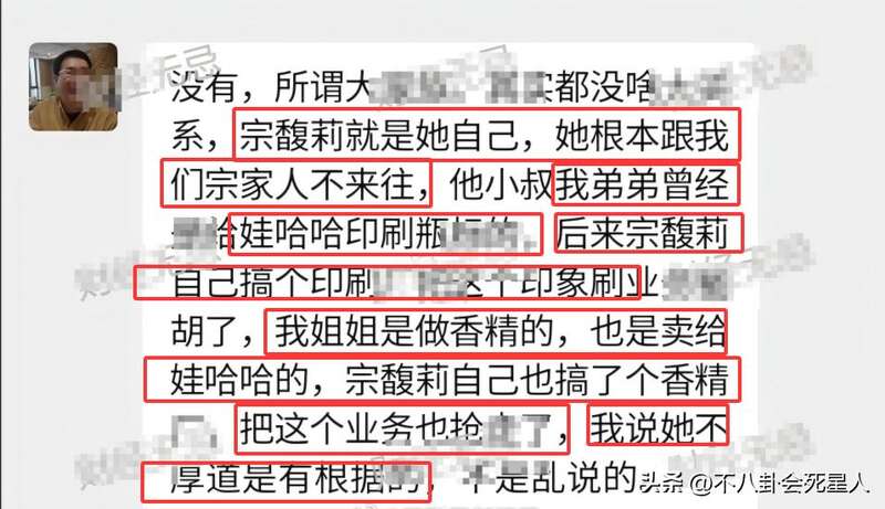 他说宗馥莉不跟宗家人来往,宗泽后的弟弟曾经给娃哈哈印刷“瓶标”,后来被宗馥莉自己弄的印刷厂“抢了”生意。