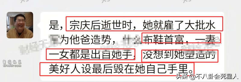 试问,在国内一夫一妻制的体制下,宗馥莉在父亲去世后,极力维护老爸爱妻爱女的人设,有何问题?所谓美好人设毁在宗馥莉自己手里,又从何说起?