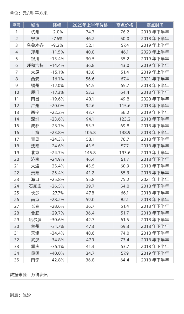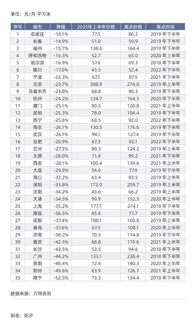 看了环比和同比变化之后,我们来看各城市2025年上半年住宅租金相对于该城市租金最高点的变化。