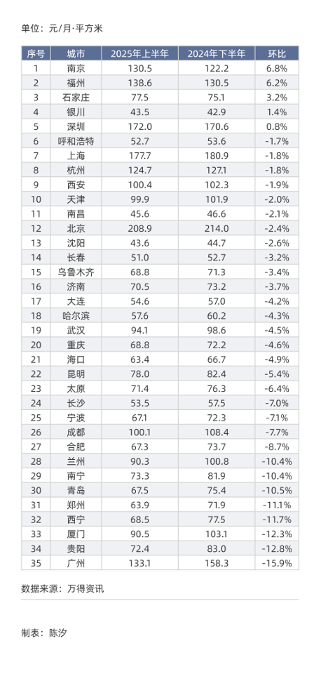 2025年上半年,商铺房租高于100元/月・平方米的城市有9个:北京(208.9元)、上海(177.7元)、深圳(172.0元)、福州(138.6 元)、广州(133.1元)、南京(130.5元)、杭州(124.7元)、西安(100.4元)、成都(100.1元);商铺房租低于60元/月・平方米的城市有8个:银川(43.5元)、沈阳(43.6元)、南昌(45.6元)、长春(51.0元)、呼和浩特(52.7元)、长沙(53.5元)、大连(54.6元)、哈尔滨(57.6元)。