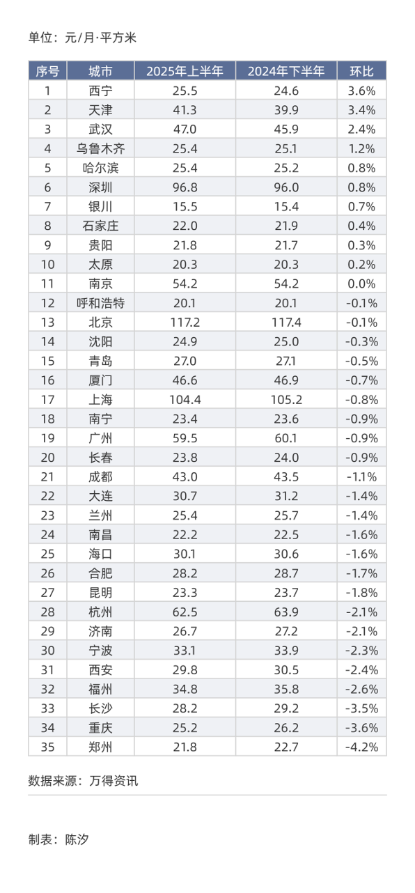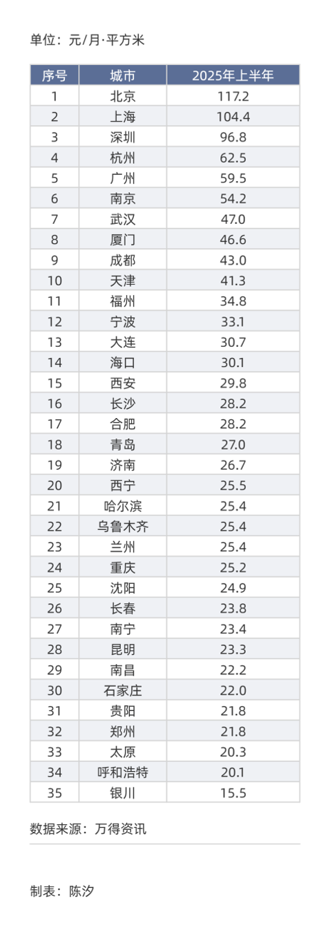 把35个城市按照2025年上半年住宅租金高低进行排序,得到表1。35城住宅租金中值为25.3元/月·平方米,均值为37.4元/月·平方米。北京租金最高(117.2元)是最低城市银川(15.5元)的7.6倍。