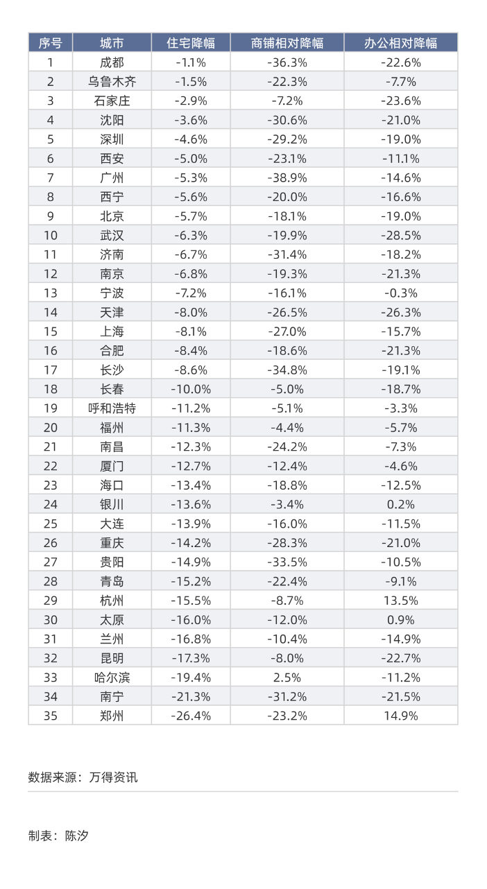 有7个城市下跌幅度超过了30%:哈尔滨下跌30.6%,兰州下跌31.7%,天津下跌34.4%,武汉下跌34.8%,重庆下跌35.1%,昆明下跌40%,南宁下跌42.8%。