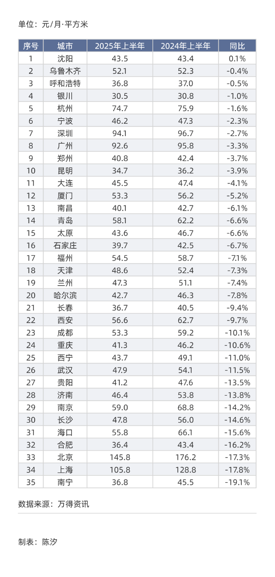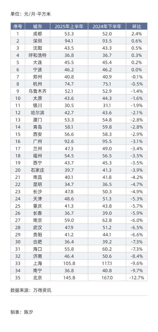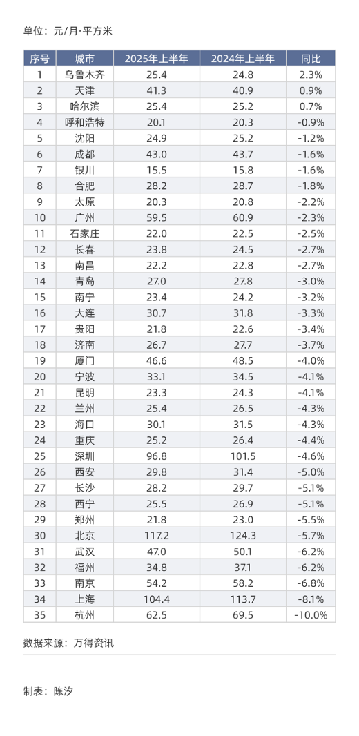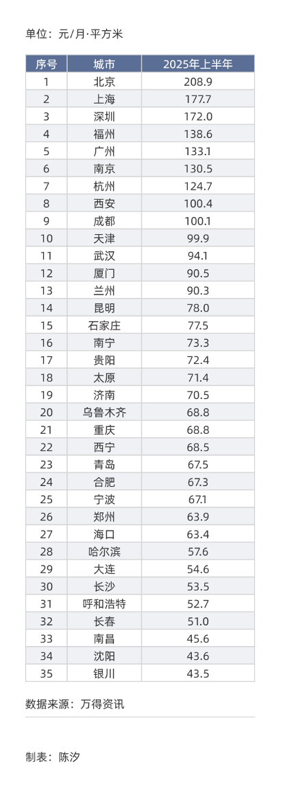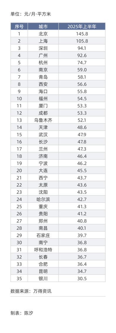 表1: 35城住宅房租排序(2025年上半年均价):