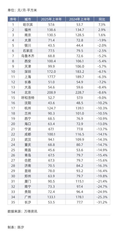 再来看同比变化,即2025年上半年住宅租金相对于2024年上半年的变化。