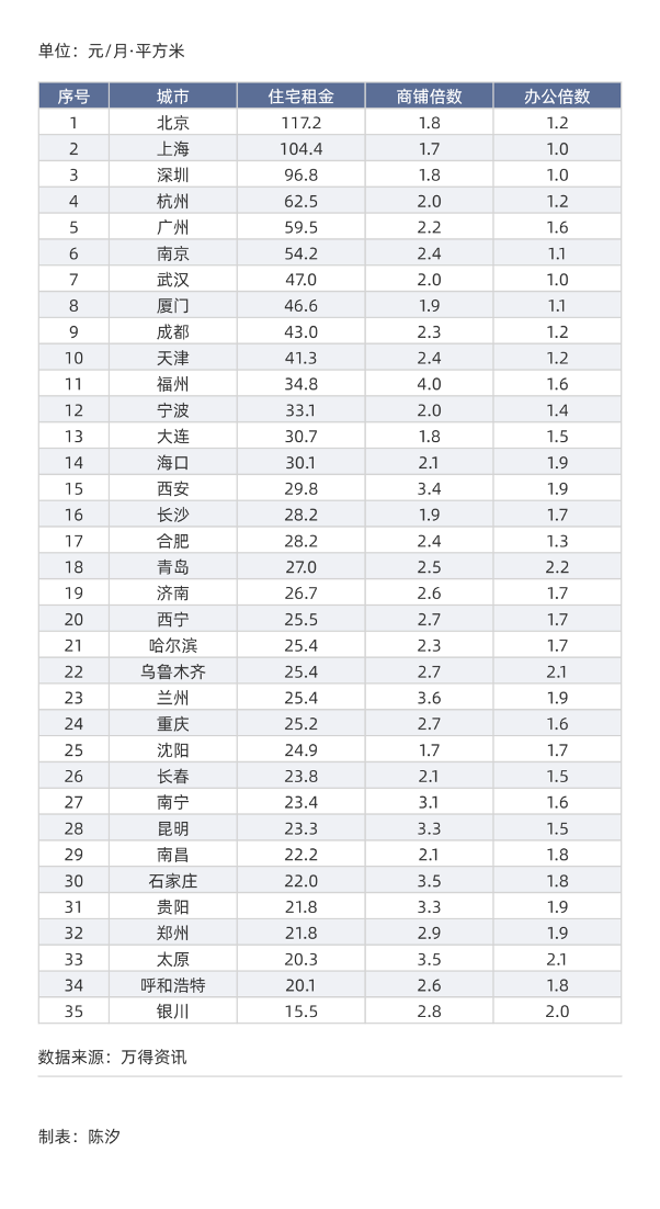 排名最后六名的是:银川(30.5元)、昆明(34.7元)、合肥(36.4元)、长春(36.7元)、呼和浩特(36.8元)、南宁(36.8元),这些城市的租金都不足40元。