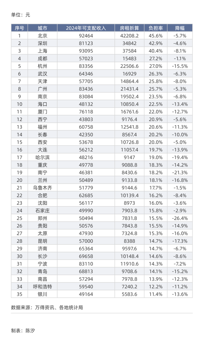 2024年,在35个城市中,城镇居民人均可支配收入大于8万元的只有七个。而在这七个城市中,六个属于“房租负担率”较高的城市。