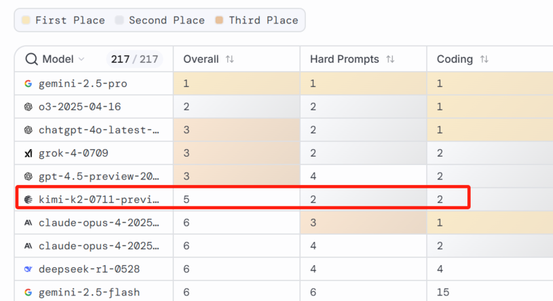 在所有大模型排名中,kimi-k2排名第五,前四模型均为闭源模型
