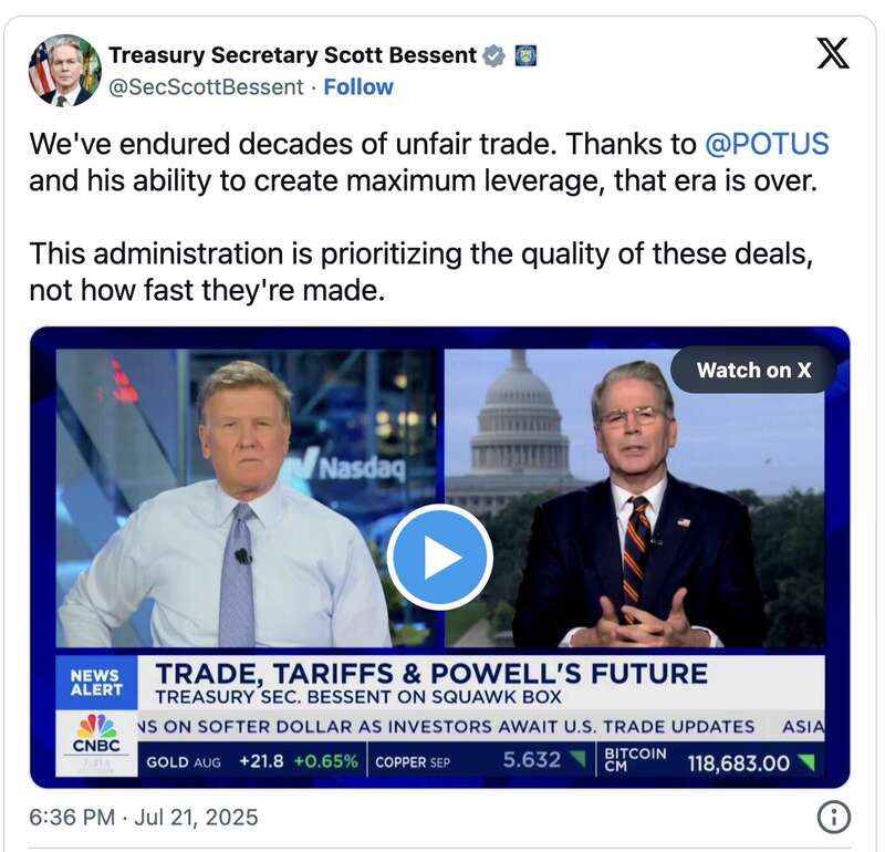 贝森特在采访中被问到这些贸易谈判的进展时说,“谈判正在推进,但重要的是协议的质量,而不是达成协议的时机。特朗普总统已经创造了最大的筹码,这是只有他才能做到的。我们看到的是,这些不平衡在20、30、40年的时间里不断累积,我们更关心的是高质量的协议,而不是在8月1日前达成这些协议。”
