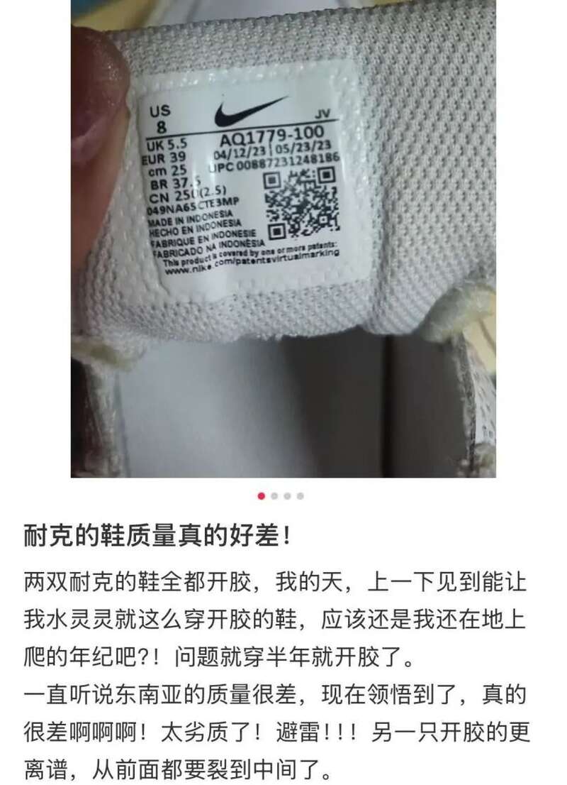 其次,耐克的质量问题也逐渐浮出水面。