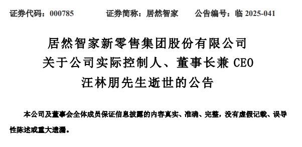 在7月28日晚,居然智家发布公告,确认了汪林朋去世的消息。公告称居然智家实际控制人、董事长兼 CEO 汪林朋于7月27日在家中不幸身故。这和之前业内传闻汪林朋“坠亡”并不一致。