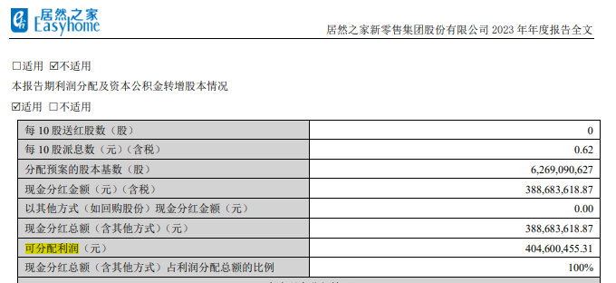 据居然智家历年财报,2020年至2023年,公司对现金分红金额(不含其他方式)分别为3.39亿元、10.48亿元、13.02亿元和3.89亿元,而同期可分配利润分别约 3.41亿元、10.49亿元、13.49亿元和4.05亿元,分红比例常年接近100%。
