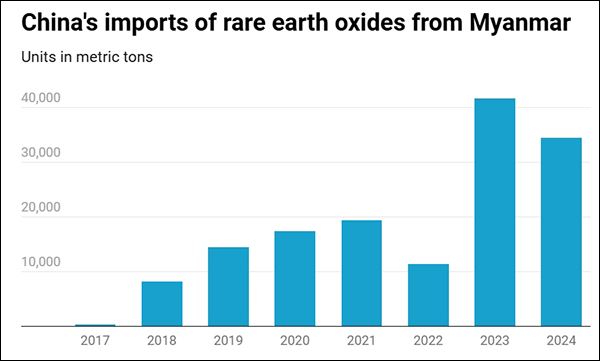 近年来,缅甸稀土产量一路飙升,从2014年稀土产量200吨上涨至2020年的3.1万吨,跻身全球前三。中国近几年也从缅甸进口了大量的稀土。根据国泰君安研报,2024年中国全口径进口稀土总量约7.73万吨,其中自缅甸进口量为4.4万吨,占比57%。