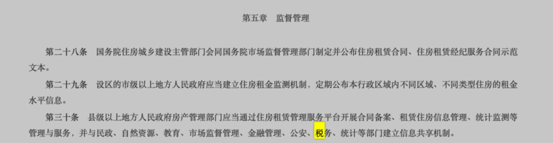 条例的第三十条同时阐明,县级以上地方人民政府房产管理部门应当通过住房租赁管理平台开展合同备案等管理与服务,并与税务等部门建立信息共享机制。