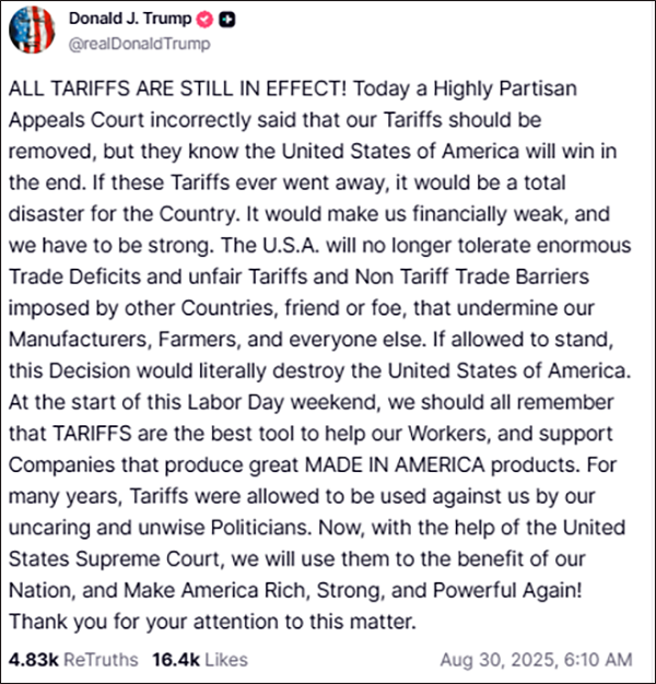 特朗普在自家社交平台“真相社交”上发文指责这项判决是错误的,上诉法院“高度政治化”,做出“不正确”的判决,“他们说关税应该取消,但他们明知美利坚合众国最终将获胜”。