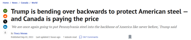 除了加墨两国外,其他国家的相关产品本就自动面临25%以上的IEEPA关税。但扩大后的232条款让华盛顿得以对加拿大商品加税——即便这些商品本应在CUSMA框架下享受零关税。这正是关键所在——这是个“漏洞利用”。