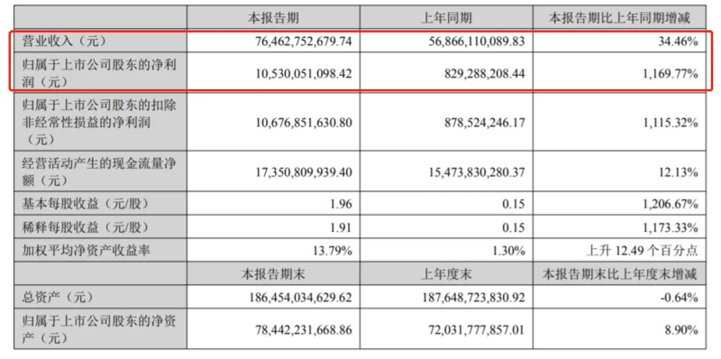 营收同比涨了34.46%,飙升至764.63亿元;净利润直接干到105.3亿元,同比暴涨了1169.77%。