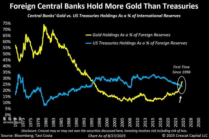 而上周,业内人士的统计显示,黄金在央行储备中的占比已自1996年以来首次超过了美国国债。