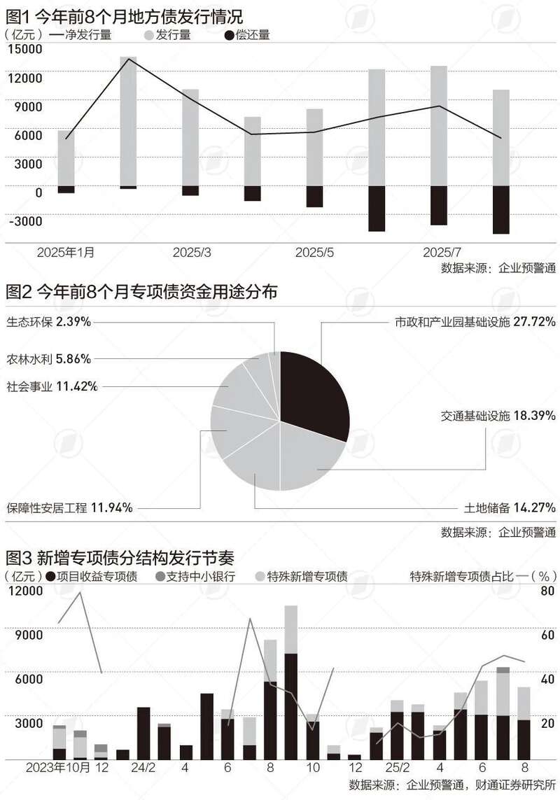 地方政府合法合规借钱渠道主要来自发行地方政府债券。根据财政部及机构数据,今年前8个月,全国发行地方政府债券合计约7.7万亿元,同比增长42%,创同期历史新高。其中,8月份地方政府借钱规模(0.98万亿元)低于前两个月,但也逼近1万亿元,整体上保持较快发行节奏。