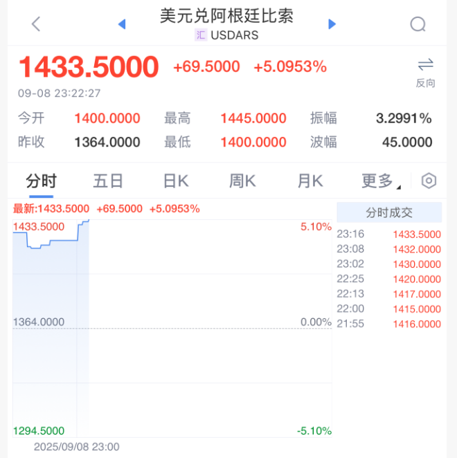部分流动性较高的2035年到期债券下跌6.6美分,报55美分(按美元计),收益率攀升至12.9%(截至当地时间9月8日上午10:45)。官方比索在当地市场开盘时一度暴跌7%,随后收复部分跌幅,其交易区间上限为1470。若突破该水平,预计阿根廷央行将入市干预。