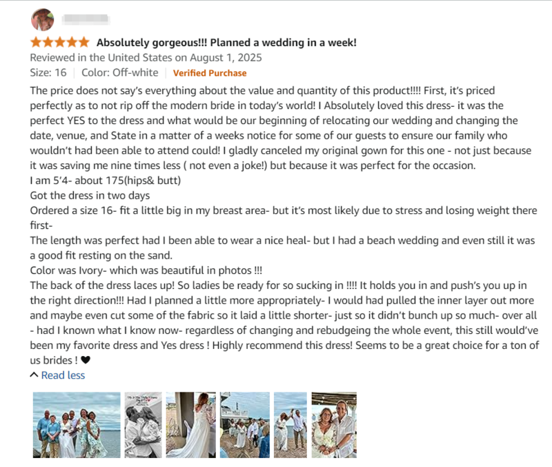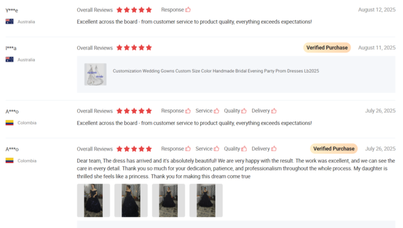 外国新娘怀着激动的心情写下好评,表示她对这漂洋过海而来的礼服有多满意,因为这件婚纱,让她的婚礼更加完美。