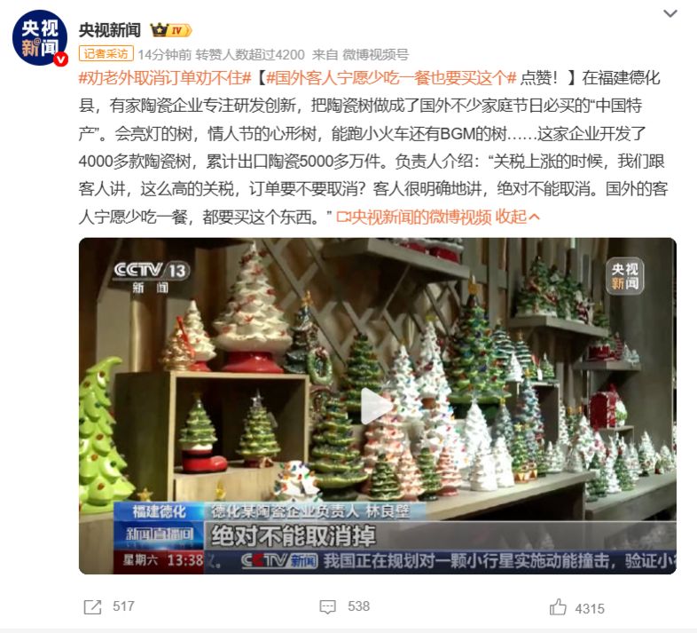 还有千年瓷都福建德化,以陶瓷闻名世界。他们独创的陶瓷圣诞树,不仅造型美观,还会发光、播放音乐,深受老外欢迎。