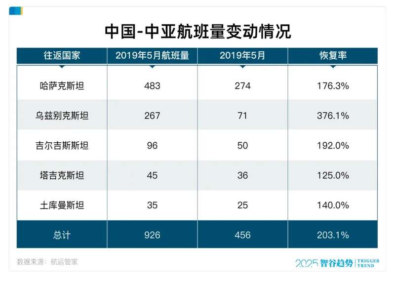 对比2019年,中欧、中美航班冷清了,但中国飞中亚的航班量却越来越密集,逆势增长了103.1%。