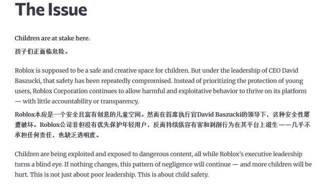 “儿童的安全正处于危险之中。Roblox本应是一个为孩子们提供安全和创意的空间。但在CEO DavidBaszucki的领导下,这种安全被一再妥协。Roblox公司非但没有优先保护年轻用户,反而继续允许有害和剥削行为在其平台上泛滥——却几乎没有任何问责或透明度。”