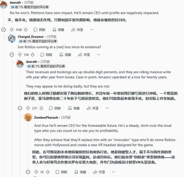 “我理解大家的愤怒,但让我们现实一点。董事会和华尔街关心的是什么?是Bookings增长了51%,是DAU突破了1.1亿。只要Baszucki能继续交出这样的成绩单,这份28万签名的请愿书对他们来说,可能只是财报脚注里的一个‘潜在风险因素’。除非用户流失开始真正影响到财务数据,否则他们不会轻易换掉一个能带来如此巨大增长的CEO。”