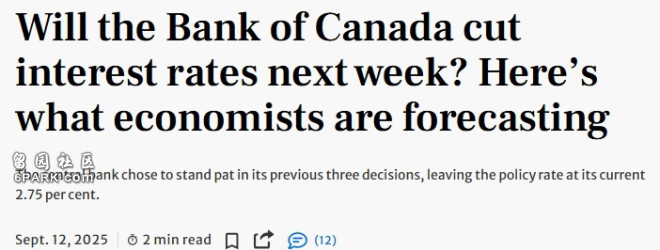 由知名银行经济学家与学者组成的智库C.D. Howe研究所的货币政策委员会预测,央行在下周三将基准利率下调25个基点,并在10月的下一次决策中再次下调25个基点。