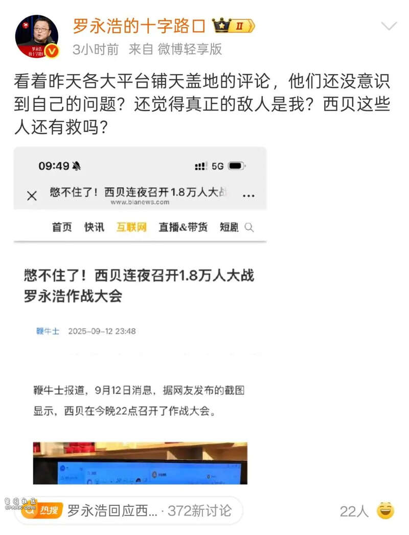 记者注意到,罗永浩本人也对此事做出回应。他在个人微博发布“作战大会”的截图并评论道:“看着昨天各大平台铺天盖地的评论,他们还没意识到自己的问题?还觉得真正的敌人是我?西贝这些人还有救吗? ”