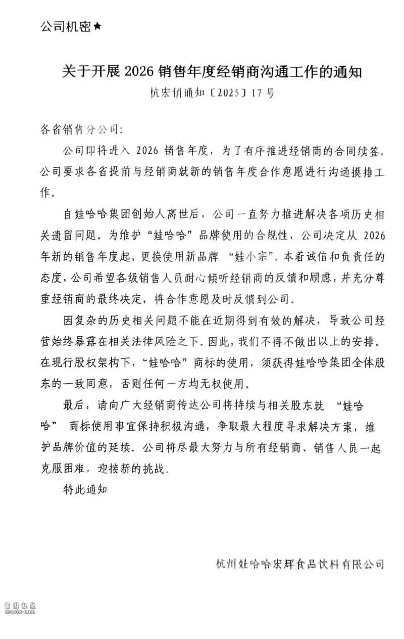 据杭州娃哈哈宏辉食品饮科有限公司的一份内部文件显示,自娃哈哈集团创始人离世后,公司一直努力推进解决各项历史相关遗留问题,为维护“娃哈哈”品牌使用的合规性,公司决定从2026年新的销售年度起,更换使用新品牌“娃小宗”。
