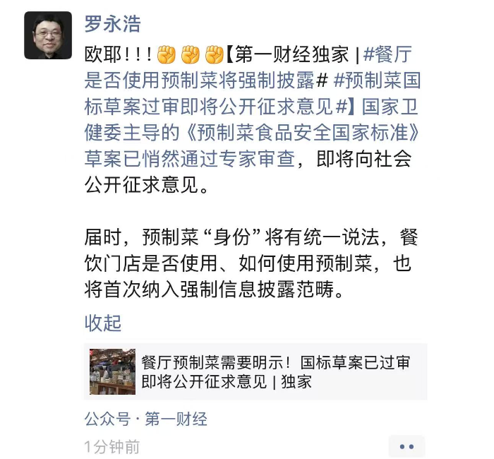 一个好消息是,就在刚刚,第一财经报道,国家卫健委主导的《预制菜食品安全国家标准》草案已悄然通过专家审查,即将向社会公开征求意见。