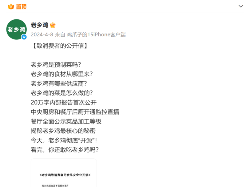 去年4月,在预制菜争议满天飞的时候,老乡鸡写给消费者一封信,直接公开了《菜品溯源报告》。