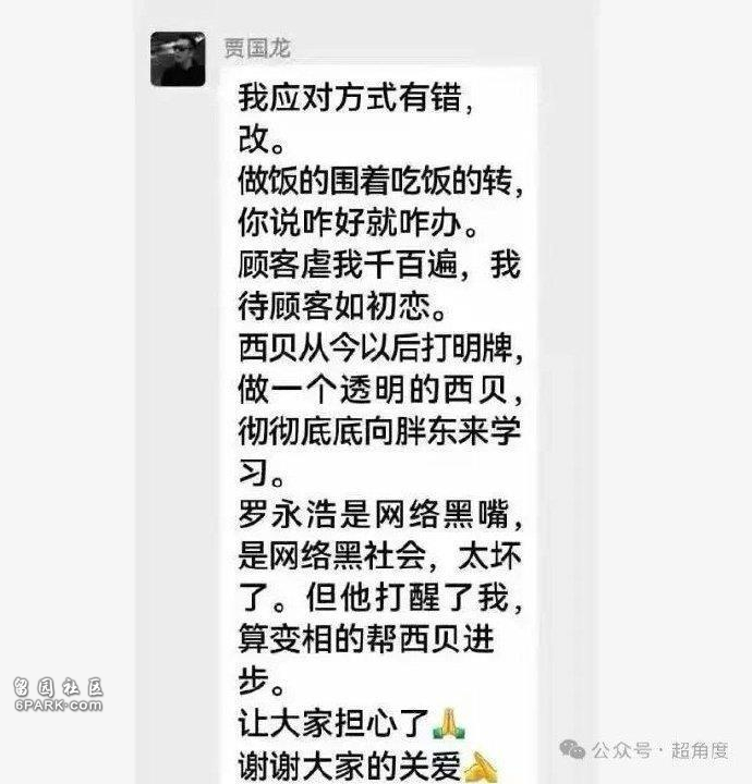 14日晚10时30分许,罗永浩在交个朋友直播间直播时,谈到了贾国龙的上述表态截图。罗永浩表示,他14日白天看到上述截图后不太当回事,“觉得他有这个态度挺好,那他就改呗。”结果当天晚上他才知道,贾国龙的截图还有后半部分:“罗永浩是网络黑嘴,是网络黑社会,太坏了。但他打醒了我,算变相地帮西贝进步。”